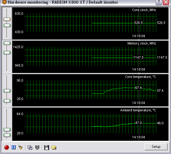 Насчет разгонов X800 XT пока ничего не могу сказать, во время тестирования у карты был BIOS, запрещающий разгон по чипу. Этот вопрос мы будем еще исследовать дальше. Хотя, надо сказать, что последняя бета-версия RivaTuner (автор Алексей Николайчук AKA Unwinder) уже поддерживает X800 в полном объеме, показывая не только число пиксельных конвейеров, но и осуществляя мониторинг по температуре:
