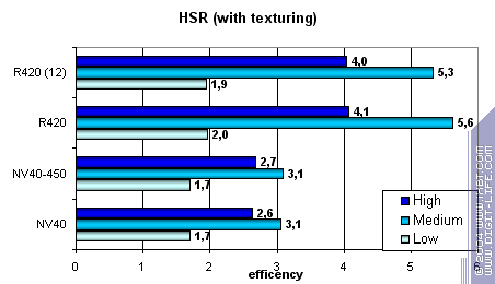Картина практически идентична, небольшие отличия в эффективности 450 МГц варианта NV40 вызваны иным соотношением частот ядра и памяти.