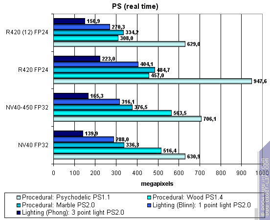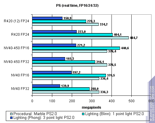 Мы видим, что NV40 на частоте 450 МГц работает быстрее. Но, недостаточно быстрее — лидер по пиксельным шейдерам игровой сложности прежний — R420.