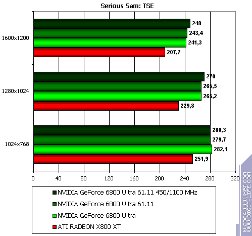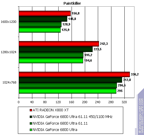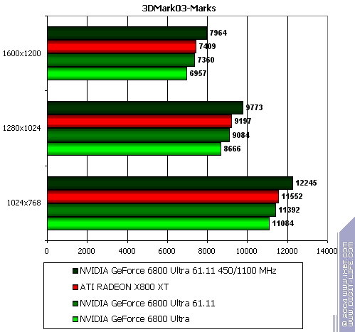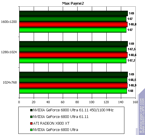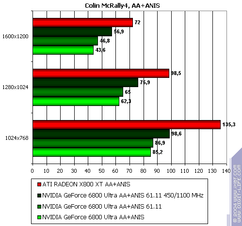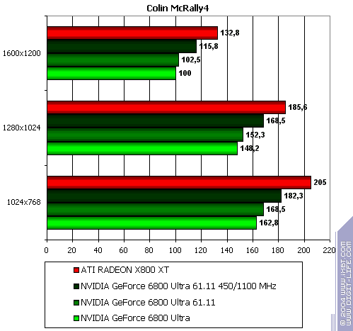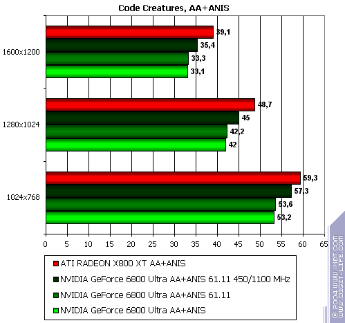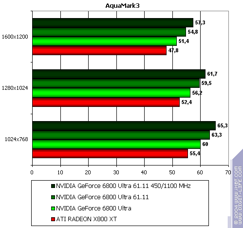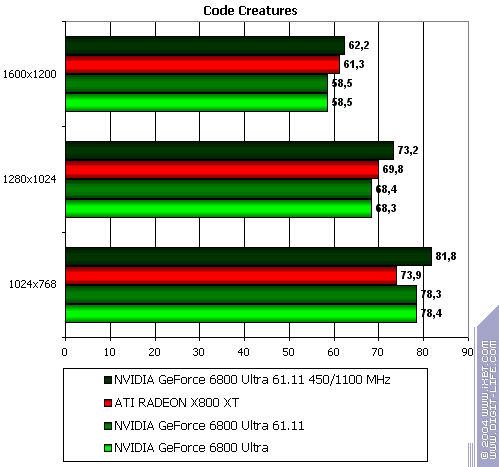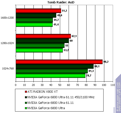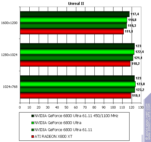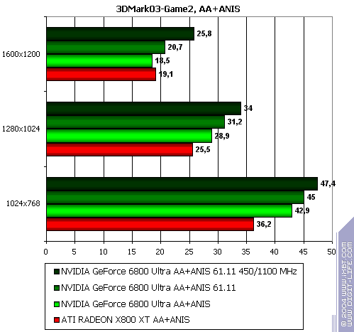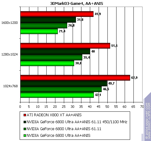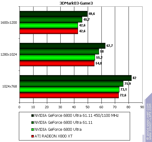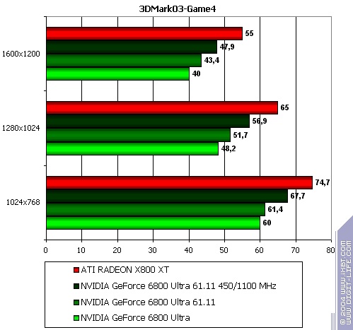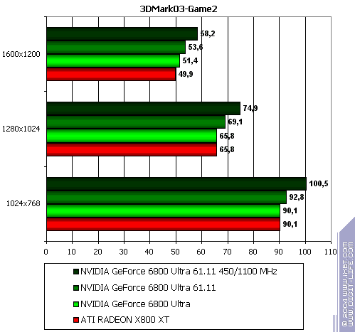 - NVIDIA GeForce 6800 Ultra 450МГц против ATI RADEON X800 XT из-за ограничений, накладываемых центральным процессором, трудно сделать выводы. Но все же видно, что X800 XT лидирует.