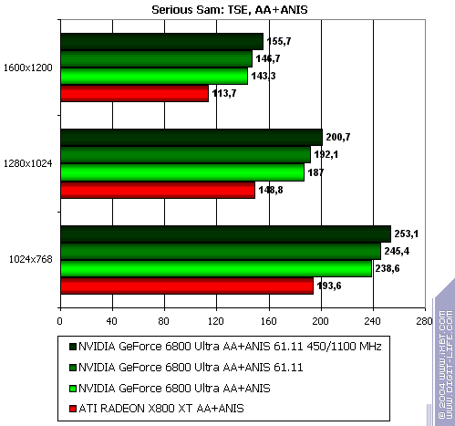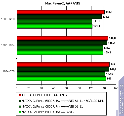 Cамый тяжелый режим с АА и анизотропией: только в 1600х1200 выявилась разница, где X800 XT оказался лидером.