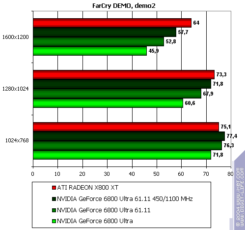 - Хочу отметить также как положительный момент, что новая версия 61.11 для GeForce 6800 Ultra очень неплоха, действительно принесла для ускорителя некоторые приросты без использования «вредных заточек». И очень надеюсь, что разработчики FarCry в патче 1.2 поправят то ужасное положение с качеством NVxx, что мы видели. И тогда сравнение будет более честным и объективным.