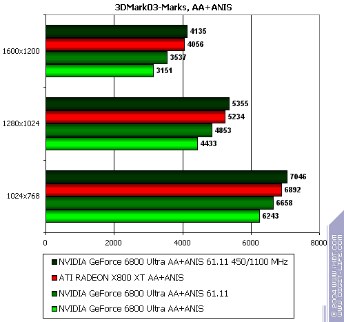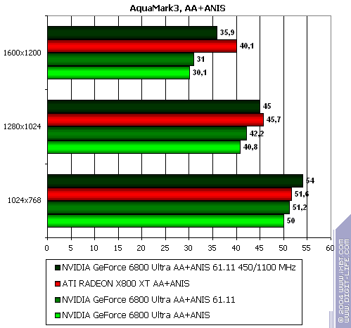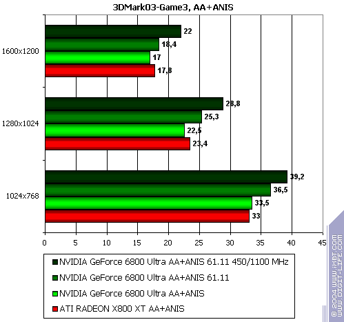 Самые легкий режим без АА и анизотропии: обратим внимание на то, как выросла скорость на 61.11. И поэтому NV40 везде выиграла!