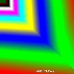 Хорошо видно, что характер оптимизаций ATI и NVIDIA несколько отличается. На цветных уровнях ATI дает своеобразный песок (не виновата ли тут та самая пресловутая пониженная точность — вместо 8, всего 5бит на компоненту?), NVIDIA — монотонные зоны без положеного в случае канонической трилинейной фильтрации плавного градиента. Лучшая по визуальным признакам фильтрация у NVIDIA в режиме без оптимизации. В общем и целом (по субъективным ощущениям), мы бы расположили участников следующим образом: