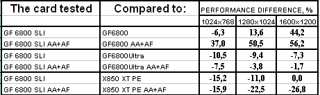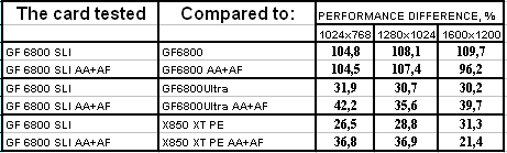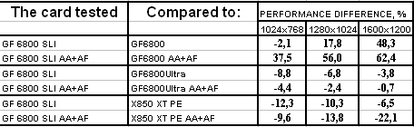 Большая процессорозависимость игры не позволила 6800 SLI достичь двукратного перевеса, скорость выросла только в 1.5 раза. А вот состязание с топовыми продуктами наш тандем проиграл, особенно касается битвы с X850 XT PE, где последний был выше аж на 20-25%.