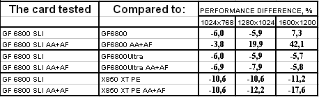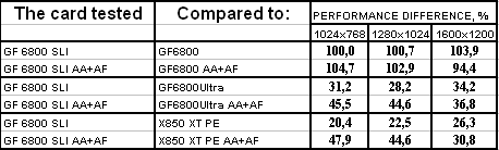 А вот тут, если учитывать именно режимы с АА+АФ (а глупо покупать две карты по 300-400 долларов и не включать такие функции), то 6800 SLI выступил очень неплохо. Если конечно поправят в драйверах некоторые огрехи в качестве, что иногда проскакивают.