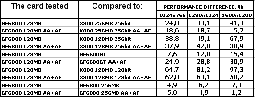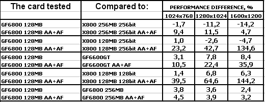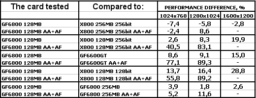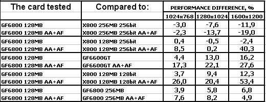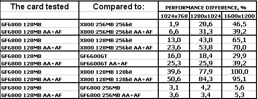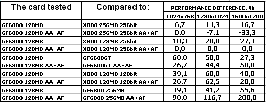 Несмотря на то, что данный тест очень требователен к производительности шейдерных блоков, влияние ПСП, то бишь частоты работы памяти у GeForce 6800, также имеет место. Несмотря на то, что объем памяти у испытуемой сегодня карты меньше, чем у 256-мегового аналога, более высокая частота работы памяти сказалась на росте скорости. В остальном — примерное равенство с конкурентом от ATI в лице X800 128MB 256бит.