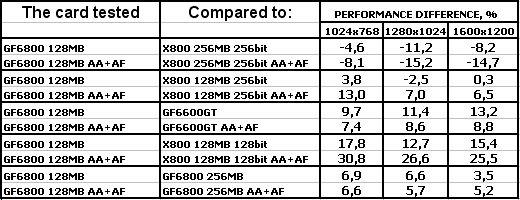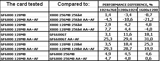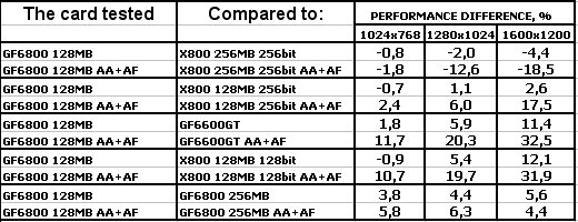 Ситуация очень разная. Где-то победы, где-то поражения, где-то паритеты. Благодаря тому, что из-за специфики драйверов ATI 128-меговые карты из этого стана резко теряют скорость с ростом разрешения в тяжелых режимах. А уровень FPS в этой игре таков, что позволяет даже на середнячках среди ускорителей играть в высоких разрешениях или с АА+АФ. Поэтому в целом GeForce 6800 себя показал неплохо.