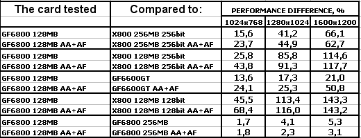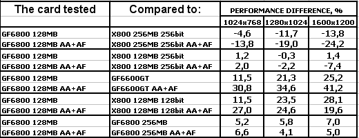 Картина следующая: изделие от Albatron очень хорошо себя показало в сравнении с конкурентом в лице X800 128MB 256bit, проиграло в тяжелых режимах более дорогой карте X800 256MB (в основном из-за повышенной ПСП у последней). В целом неплохо.