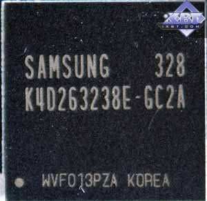 | Карта имеет 128 МБ памяти DDR SDRAM, размещенной в 8-ми микросхемах на лицевой стороне PCB. Микросхемы памяти Samsung. Время выборки у микросхем памяти 2.8 ns, что соответствует частоте работы 350 (700) МГц. | ![]() |