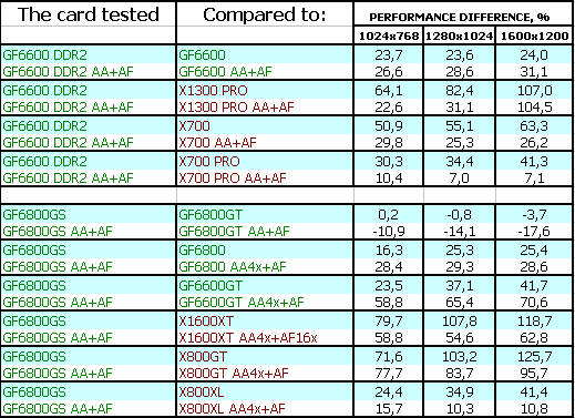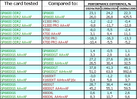 Игра уже довольно проста для современных ускорителей, поэтому даже 6600 DDR2 можно гонять с АА+АФ, и в этих режимах мы видим, что победа опять-таки за новинками от NVIDIA (в том числе и 6800 GS).