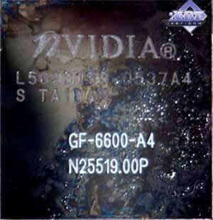 Под системами охлаждения, как обычно, сердца видеокарт — GPU. На 6600 DDR2 трудно ожидать чего-то уникального. Там простой GeForce 6600. Отмечу, что NVIDIA перешла на маркировку чипов прямо на кристалле (ранее название наносилось на подложку чипа).