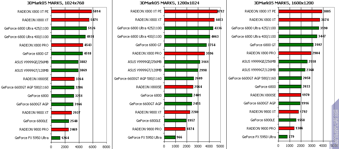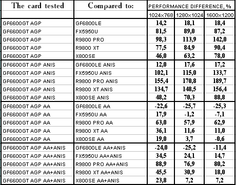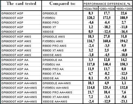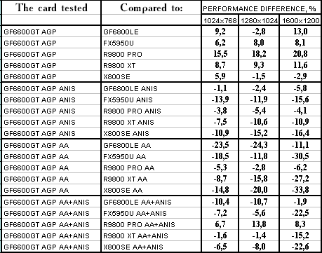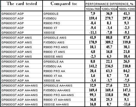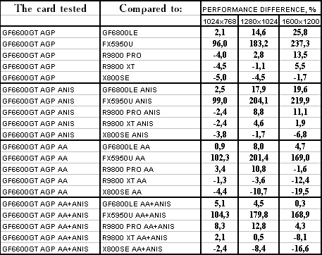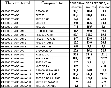 - GeForce 6600GT AGP — против GeForce FX5950 Ultra ($350) понятное, что там, где шейдеры 2.0 в чистом виде, там FX-ам делать нечего, и победа над ними обеспечена.
