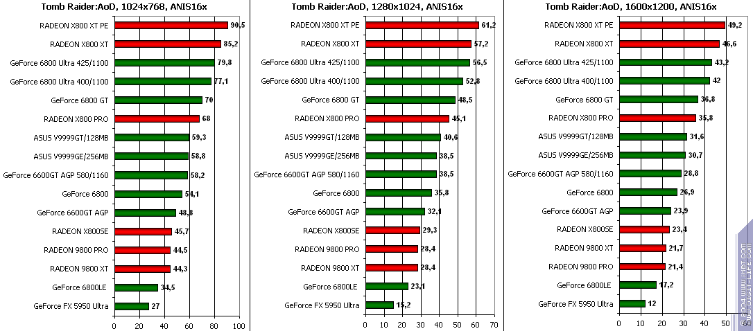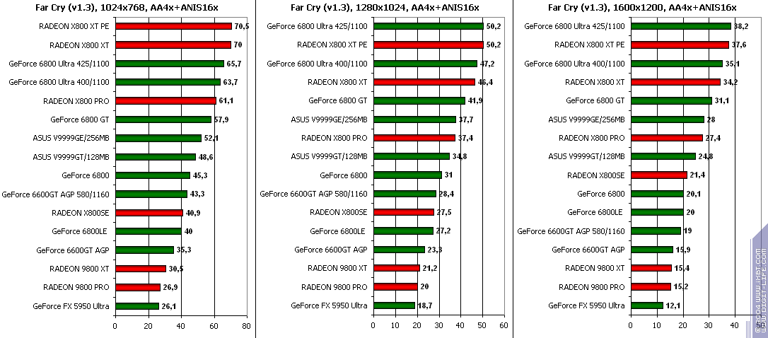 - GeForce 6600GT AGP — против GeForce FX5950 Ultra ($350) поражение! Хорошо, 256-битная шина у 5950 помогла той выиграть при АА, но почему с АФ проигрыш? — Непонятно.