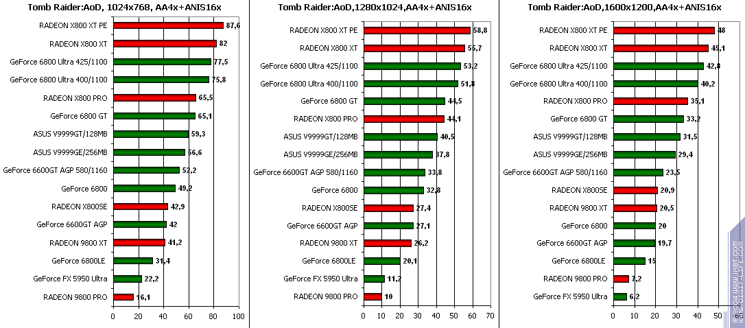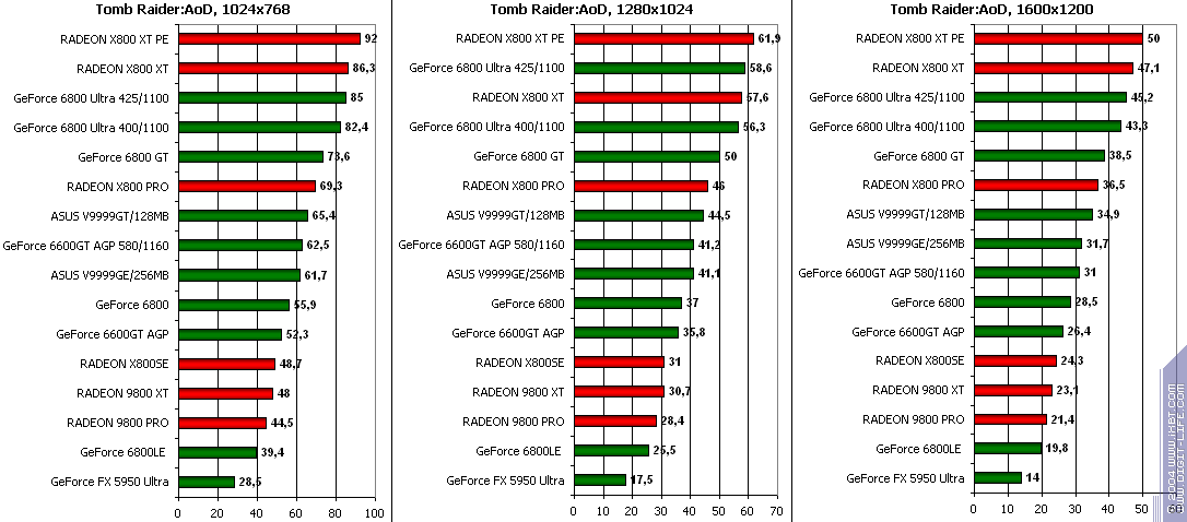 - GeForce 6600GT AGP — против GeForce FX5950 Ultra ($350) аналогично тесту TRAOD, победа и беспрекословная.