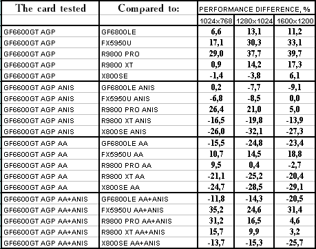 - GeForce 6600GT AGP — против RADEON 9800 PRO ($220) тоже небольшое поражение! Очень странно, что в режимах с АА и АФ раздельно — проигрыш, а с АА+АФ — победа. Как-то странно во многих текстах себя ведет 9800 PRO, такое ощущение, что все оптимизации выключились с переключением ATI на X800.