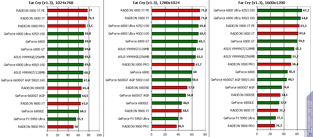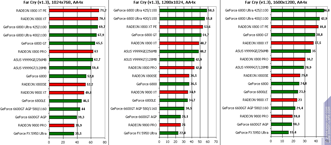 - GeForce 6600GT AGP — против RADEON 9800 XT ($350) победа (думаю, что понятно, что в данной игре продукты NVIDIA будут быстрее, и мы уже писали про это).