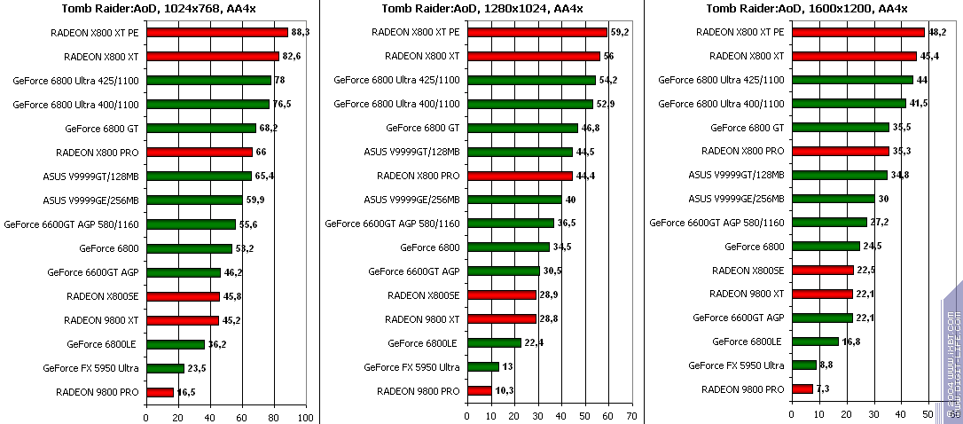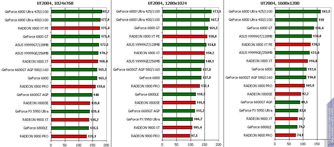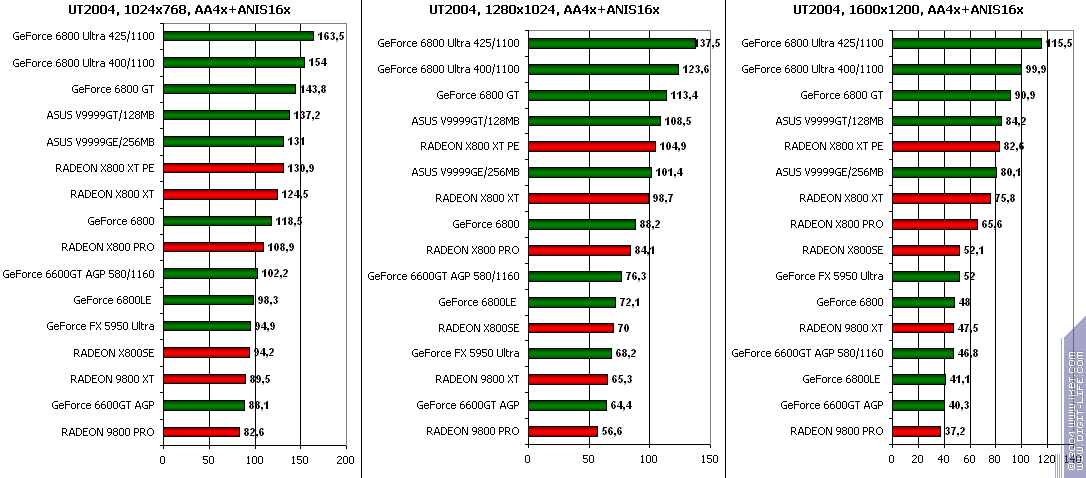 - GeForce 6600GT AGP — против GeForce 6800LE ($280) то же самое, победа.