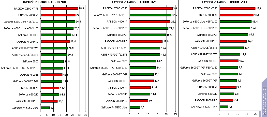 - GeForce 6600GT AGP — против RADEON 9800 XT ($350) и опять… Проигрыш по АА и АФ, а в финальном тесте с АА+АФ победа… Удивительно, но факт. Явная проблема с драйверами для 9800 PRO у ATI.