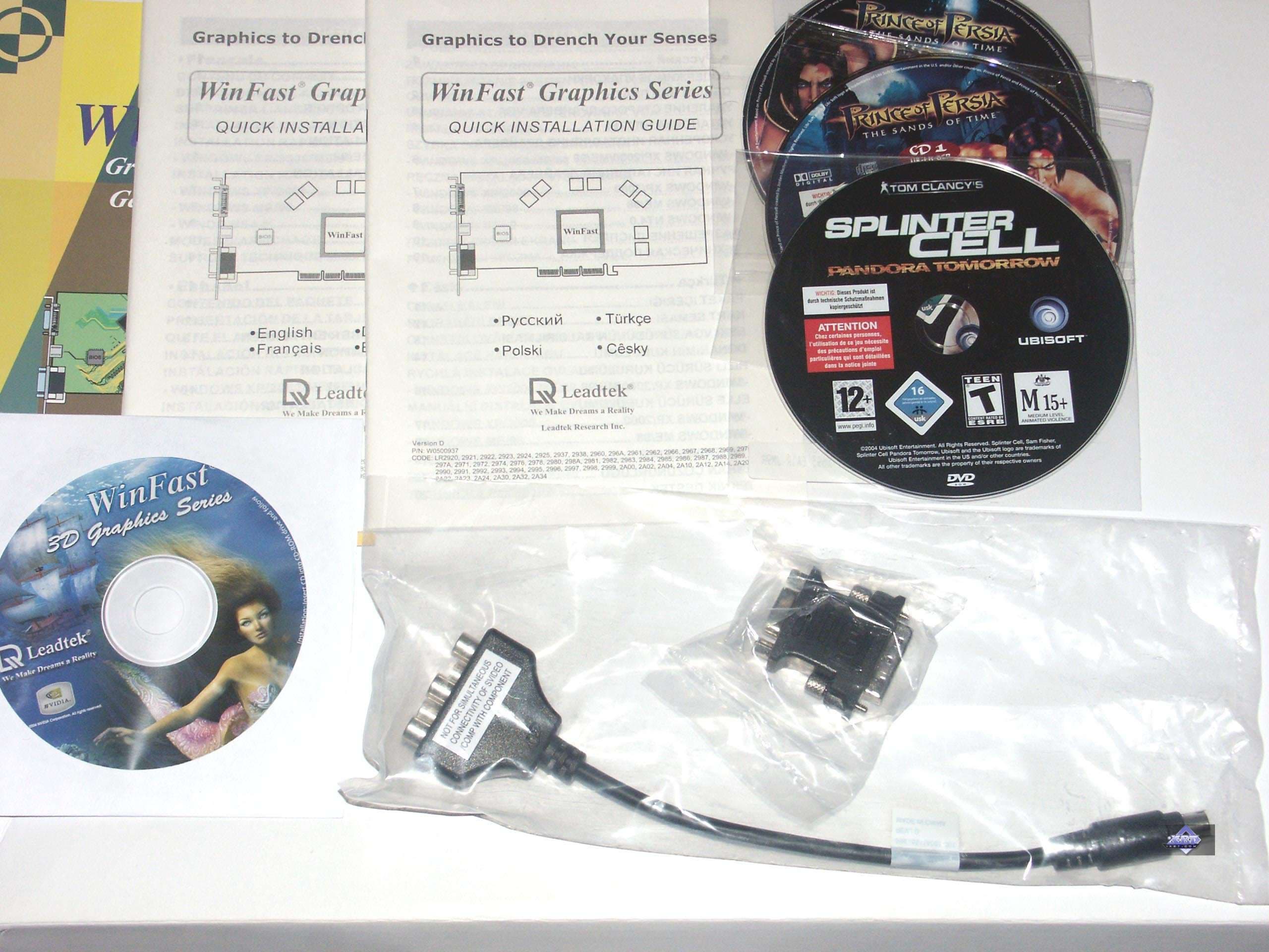 | В коробке можно найти руководство пользователя, диск с драйверами, WinDVD, две игры: PoP и SCPT. удлинители TV, переходники DVI-to-d-Sub, SVideo-to-HDTV. | ![]() |