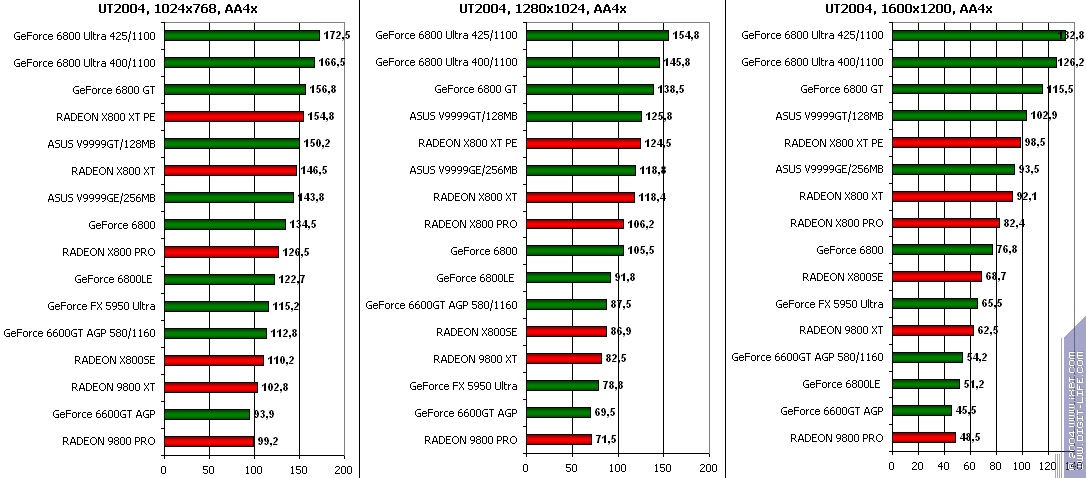 - GeForce 6600GT AGP — против RADEON 9800 XT ($350) аналогично.