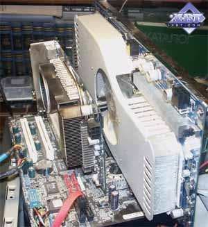 Как покажет практика, с таким мощным кулером оба графических ядра могут спокойно работать и на частотах 6800 Ultra (425 MHz), а память сам Бог велел разгонять до 550 (1100) МГц, учитывая, что она 1.6ns. Поэтому данный продукт может демонстрировать нам, по сути, и Dual 6800 Ultra.