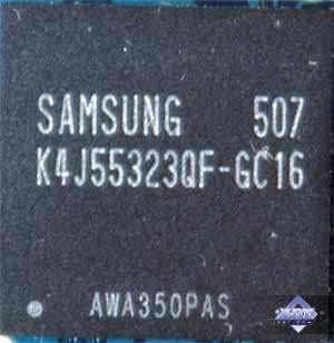 | Карта имеет 2 × 256 МБ памяти GDDR3 SDRAM, размещенной в 16-ти микросхемах на лицевой стороне PCB. Микросхемы памяти Samsung (GDDR3). Время выборки у микросхем памяти 1.6 ns, что соответствует частоте работы 625 (1250) МГц. | ![]() |