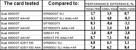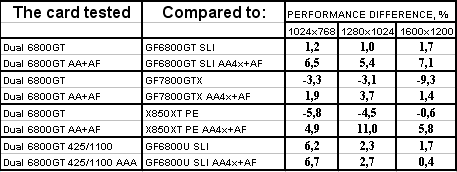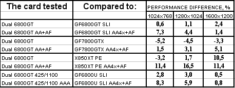 Для тех читателей, которым явно мало одной игры Far Cry для оценки этой карты я советую обратиться к нашим 3DGiТогам, где есть сравнения 6800 GT SLI с массой других продуктов, плюс накинуть 3-5% сверх. Все легко и просто.