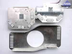 Не правда ли, просто монстр? :) Конструкция PCB такова, что на ней последовательно расположено два GPU-блока: чип плюс окружающие его микросхемы памяти. Поскольку и так длина карты стала запредельной, то для размещения силового блока потребовалось один GPU-блок сместить по вертикали, и поэтому они оказались расположены уже не по горизонтали, а по диагонали. Это привело к увеличению высоты карты в целом. Вот так те же две платы выглядят на стенде: