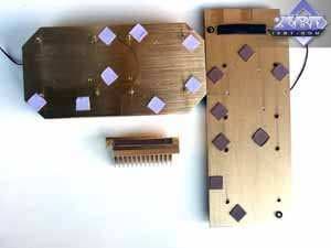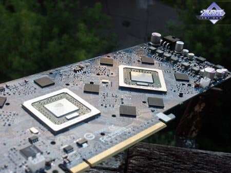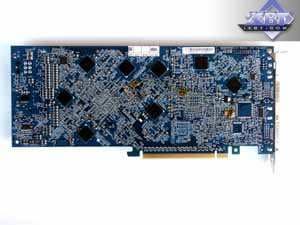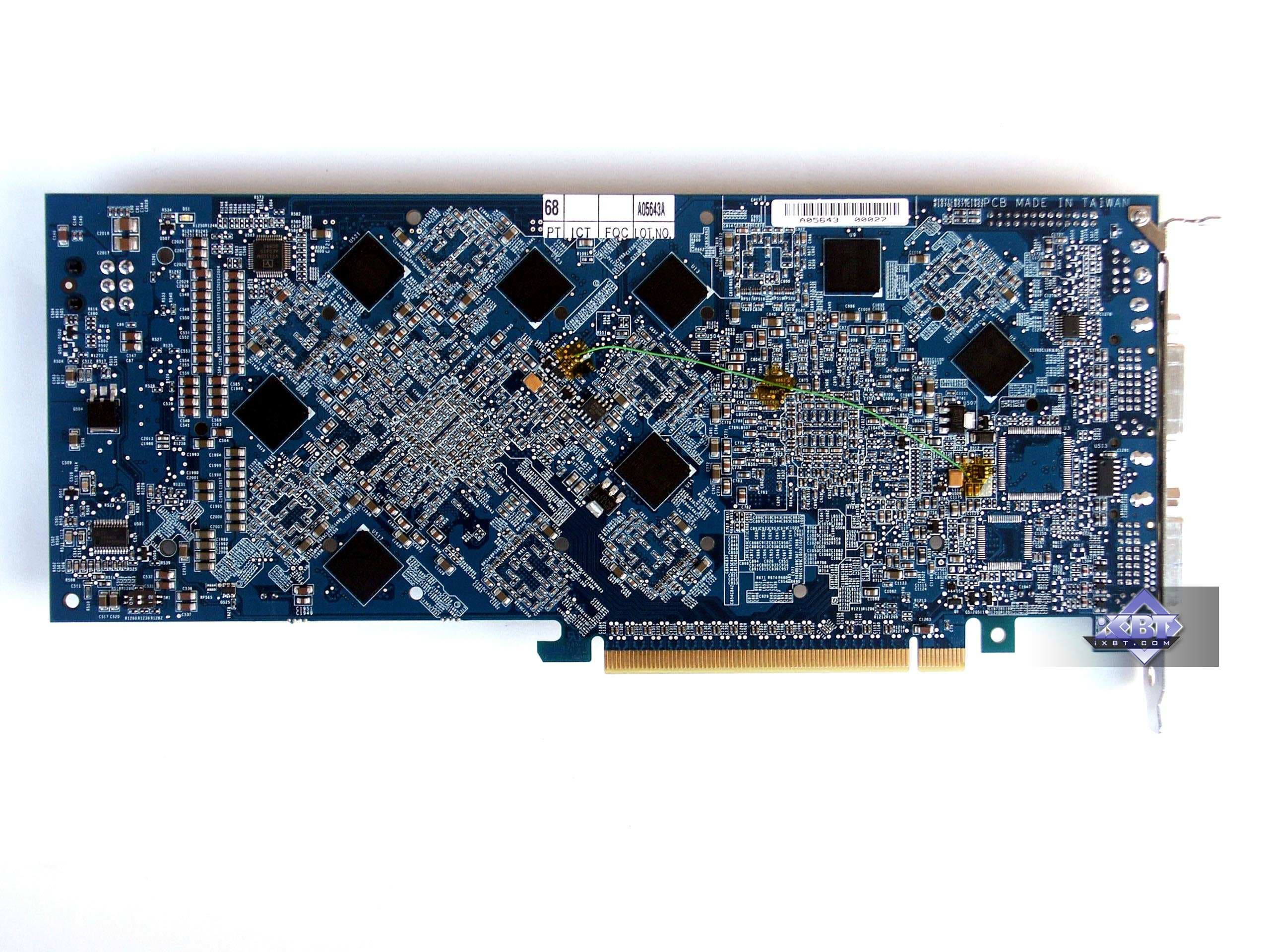 - В каждом блоке (GPU+его микросхемы памяти) половина чипов памяти перенесена на оборот PCB, в результате чего площадь, занимаемая блоком, уменьшилась, хотя все равно микросхемы не друг под другом, как на 512-мегабайтных PCB (например, от GeForce 7800GTX).