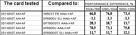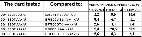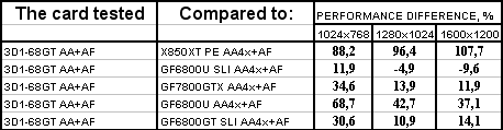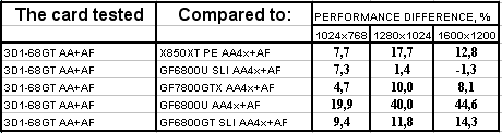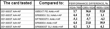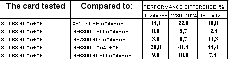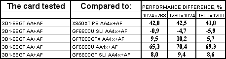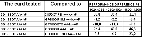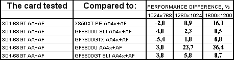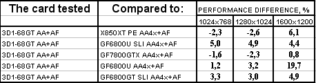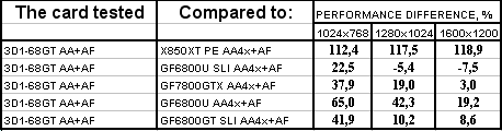Результаты тестирования полностью соответствуют ожиданиям: небольшое отставание от 6800 Ultra SLI, а в остальном — перевесы, из-за более высоких частот 3D1-68GT и 6800 GT SLI остался позади.