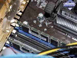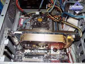 В отличие от аналогичного продукта от ASUS, наличие такого мощного кулера не дало возможности разгона графических ядер до частот 6800 Ultra (425 MHz), однако память сам Бог велел разгонять до 600 (1200) МГц, учитывая, что она 1,6 ns. Поэтому данный продукт не сможет демонстрировать нам 6800 Ultra SLI. Полагаю, что причина кроется в одном из ядер, которое просто физически не тянет частоту выше 400 МГц (не всегда 6800GT может потянуть 425 МГц). Впрочем, разгон до 400/1100 МГц — легко осуществим на данной карте, поэтому можно гипотетически представить, как работал бы тандем 6800 Ultra SLI, если бы впоследствии не повысили частоту ядра с 400 до 425 МГц.