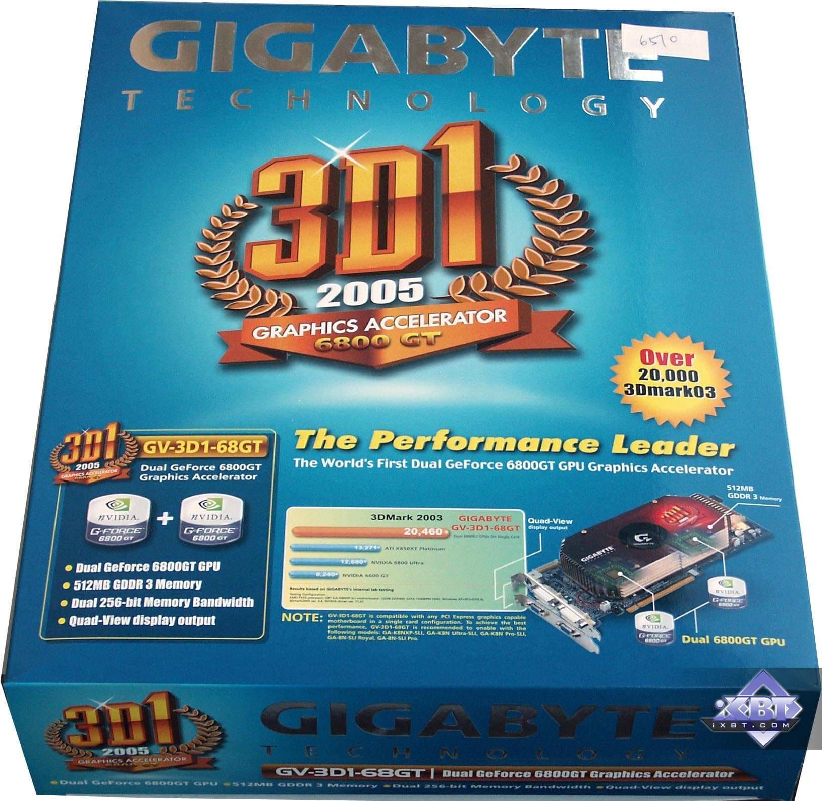 Итак: Gigabyte 3D1-68GT (Dual GeForce 6800GT) 2x256MB PCI-E — как и в случае аналогичного продукта от ASUS, данная карта — это имиджевая вещь, предназначенная для фанатов и заядлых любителей всего нового и экстремального. Представляет собой два 6800 GT на одной плате в режиме SLI. Выйти чуть вперед относительно аналогичного тандема из двух карт наверняка позволила особая реализация адаптера SLI внутри самой PCB, а также измененные тайминги памяти (ведь для такой уникальной разводки разработчикам пришлось писать свою версию BIOS). Ответить на вопрос: можно ли поставить две такие карты и объединить в SLI, пока нельзя, так как разводка этого не предусматривает. Впрочем, последние версии драйверов уже позволяют устанавливать SLI без адаптера, поэтому никто не мешает поставить две 3D1-68GT и объединить их.