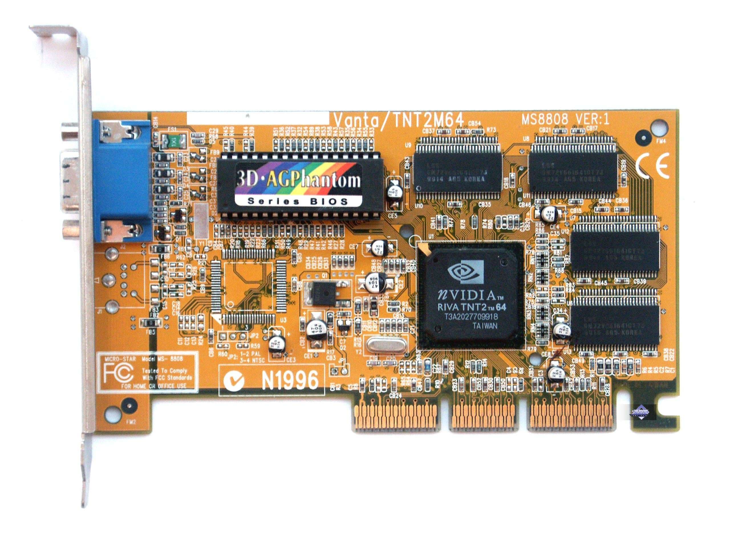 | MSI TNT2/M64/Vanta 32MB SDR 64bit, 125/143 MHz (2 пиксельных конвейера по 1-му текстурному блоку на каждом, при мультитекстурировании — 1 конвейер с 2-мя текстурниками, возможностей аппаратной обработки геометрии и освещения нет) |  |
