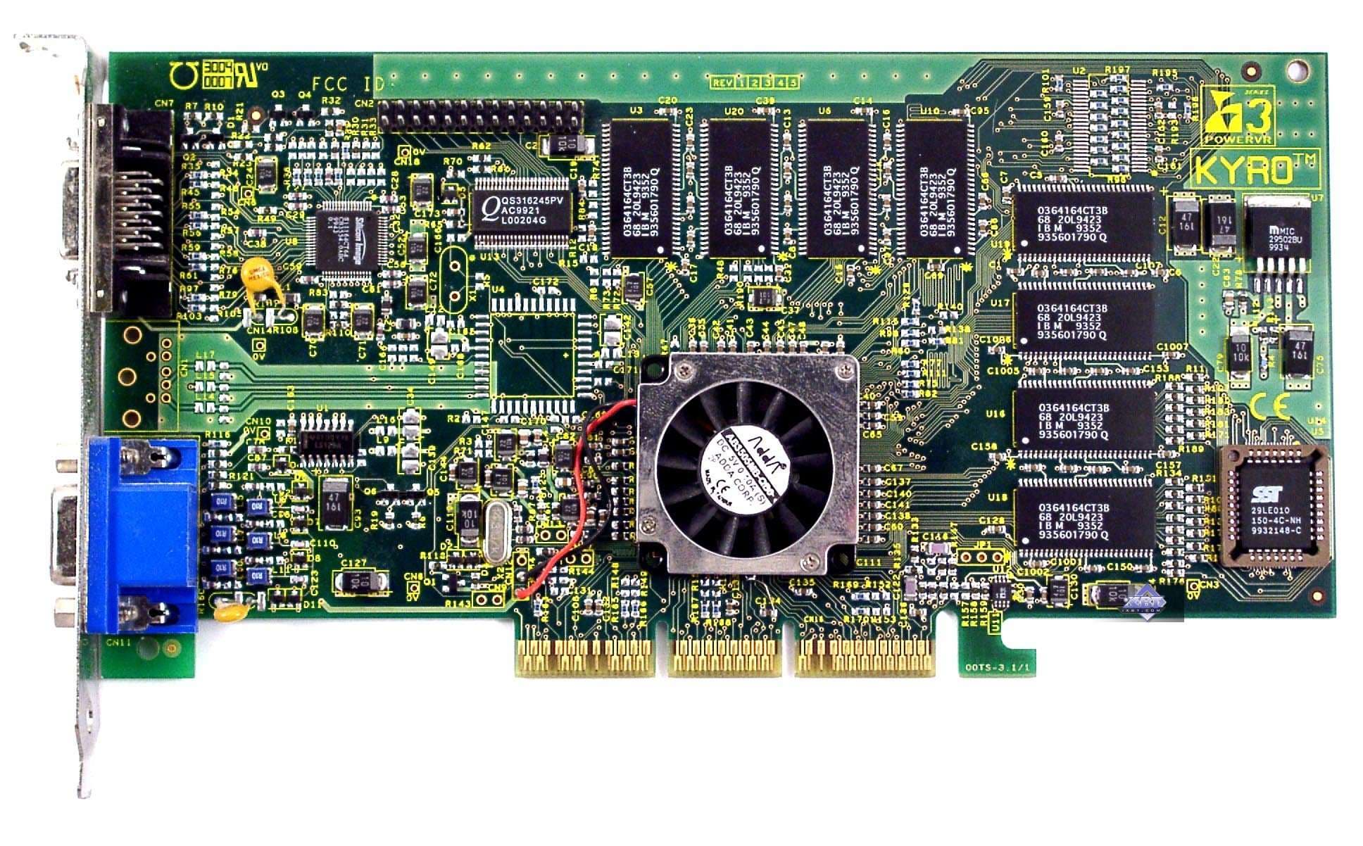 | Reference card PowerVR (Imagination Tech.) KYRO 64MB SDR 128bit, 115/115 MHz (2 пиксельных конвейера с 1-им текстурным блоком на каждом, тайловая архитектура, имеется возможность обработки до 8 текстур за проход, блок аппаратной обработки геометрии и освещения отсутствует) |  |