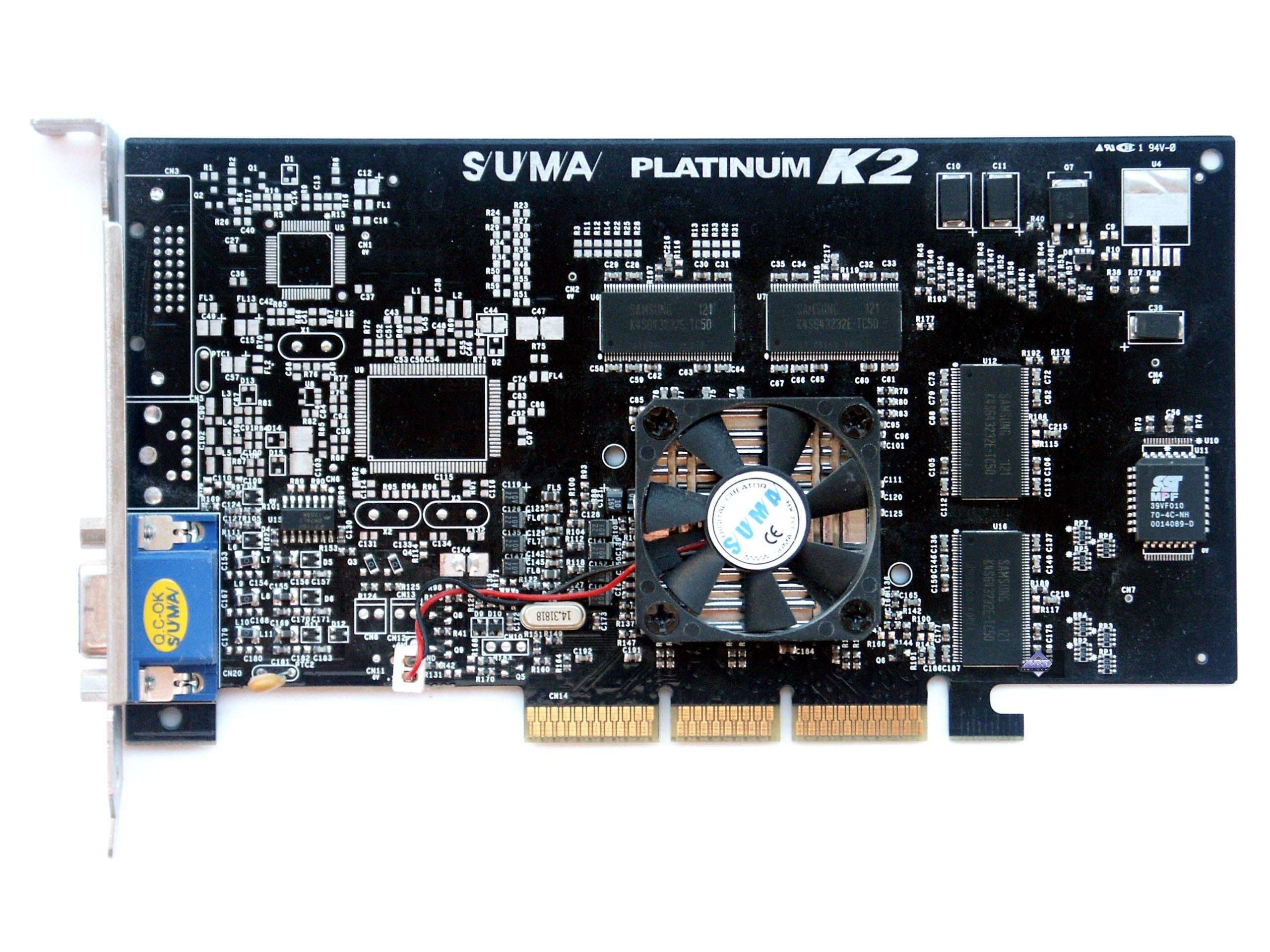 | S/U/M/A/ Platinum K2 32MB SDR 128bit, 175/175 MHz (2 пиксельных конвейера с 1-им текстурным блоком на каждом, тайловая архитектура, имеется возможность обработки до 8 текстур за проход, блок аппаратной обработки геометрии и освещения отсутствует) |  |