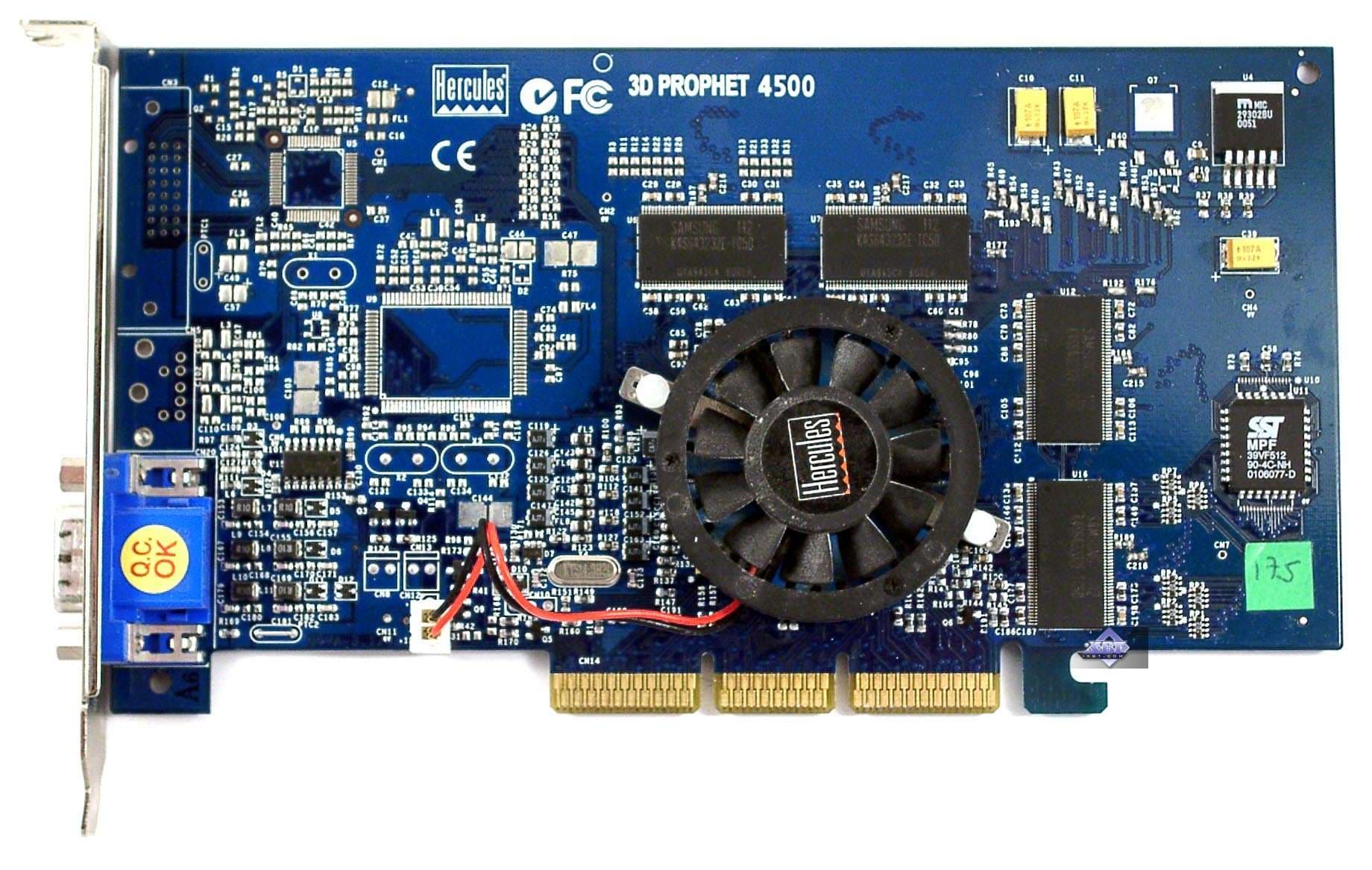 | Hercules 3D Prophet 4500 64MB SDR 128bit, 175/175 MHz (2 пиксельных конвейера с 1-им текстурным блоком на каждом, тайловая архитектура, имеется возможность обработки до 8 текстур за проход, блок аппаратной обработки геометрии и освещения отсутствует) |  |