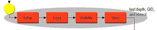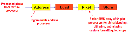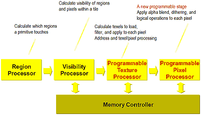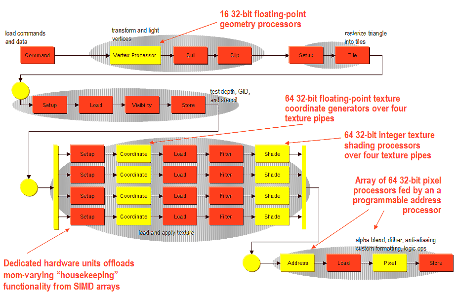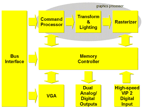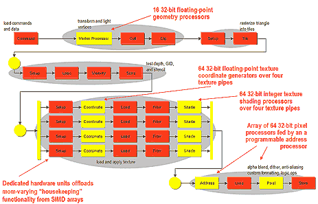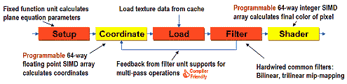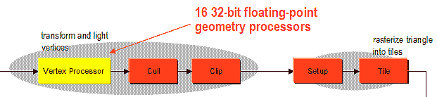 Как обычно в трехмерной графике, наблюдается четкая последовательность поточного прохождения данных через функциональные блоки ускорителя.