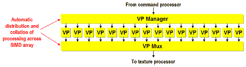 - (7) 16 скалярных плавающих процессоров объединяются по 2, 3 или 4 для обработки векторных величин. Т.е. полные 4D векторные команды выполняются по 4 за такт, так же, как и на R300 или NV30, а скалярные и 2D/3D векторные команды исполняются в большем числе, в зависимости от комбинации команд ждущих выполнения.