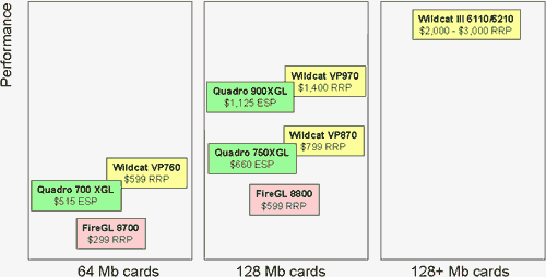 - Wildcat VP760: 64 MB of 256-bit DDR SDRAM; 165M Vertices/Sec; 23G AA Samples/Sec; Это решение также позиционируется для CAD приложений и являет собою разумный компромисс между ценой и мощностью.