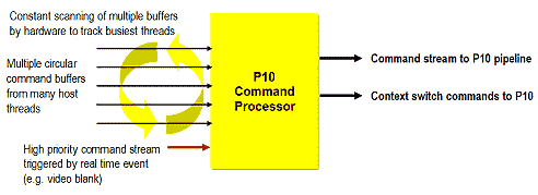 который не только дирижирует 3D конвейером, организуя некий графический аналог "многозадачности" (на основе переключения контекстов), распространенной в современных CPU, но и выполняет приоритетные команды, требующие немедленной реакции "вне очереди", такие, как переключение видеостраниц и пр.