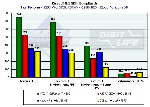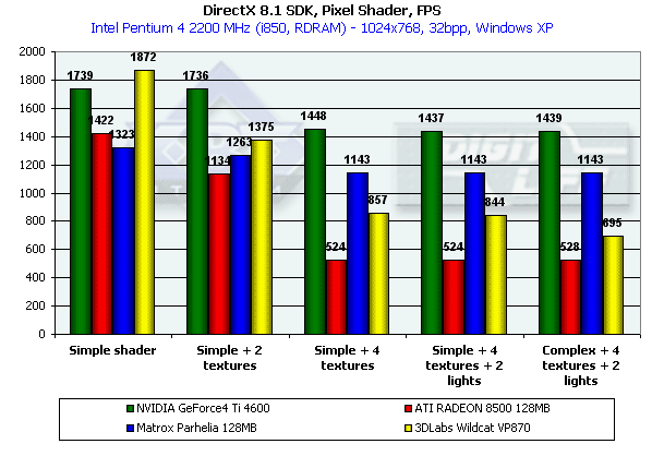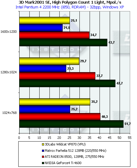 При наличии одного источника света Ti 4600 показывает себя абсолютным лидером. Его результат не только значительно (более, чем в 2 раза) превосходит Parhelia, но и (что более важно) вплотную приблизился к значению практического предела пропускной способности по треугольникам, полученному ранее с помощью Optimized Mesh из DX8.1 SDK. Впрочем, не будем умалять достоинств RADEON 8500, также приблизившегося к предельной цифре, полученной в тесте из SDK. А вот с P10 и Parhelia ситуация далека от идеала. Особенно далека от него Matrox Parhelia.