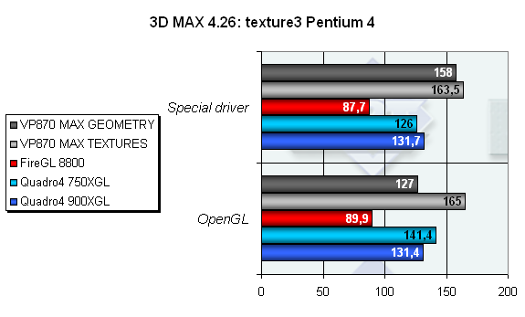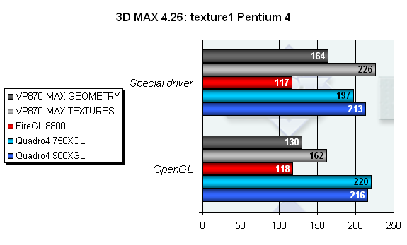 И последний режим текстурирования. В этом тесте также присутствует и достаточно сложная геометрия, и немалое количество текстур. Тем не менее, соблюдается некоторая пропорциональность — одно не довлеет над другим. За счет этого карта VP870 является абсолютным лидером в режиме оптимизации текстур. Чуть хуже дело обстоит с режимом оптимизации геометрии, особенно в OpenGL. В данном тесте мы исследуем именно текстурирование, а с ним у карты всё получилось хорошо.