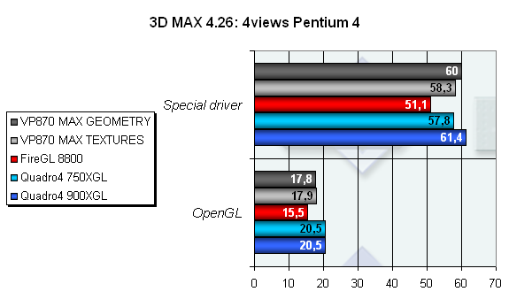 Тестовая сцена 4views, показывает нам, одновременное отображение в четырех областях проекции. И в этом тесте VP870 держится примерно на уровне своих соперников от NVIDIA. В разных режимах чуть лучше, чем Quadro4 750XGL, но чуть хуже Quadro4 900XGL, причем только при использовании специального драйвера. В чистом OpenGL он проигрывает картам линейки Quadro4. Отчасти это объясняется тем, что карты от NVIDIA обладают бОльшим числом поддерживаемых OpenGL расширений (см. таблицу расширений OpenGL).