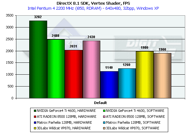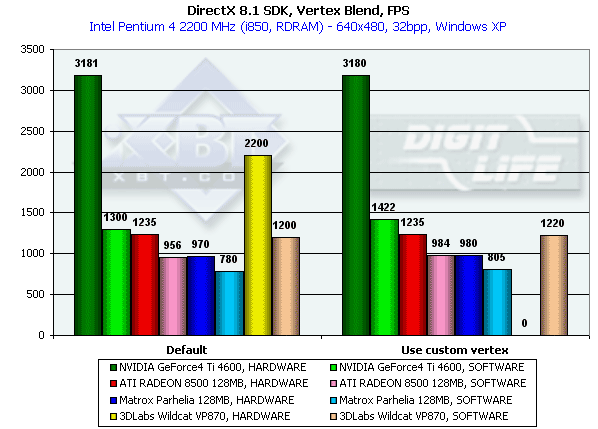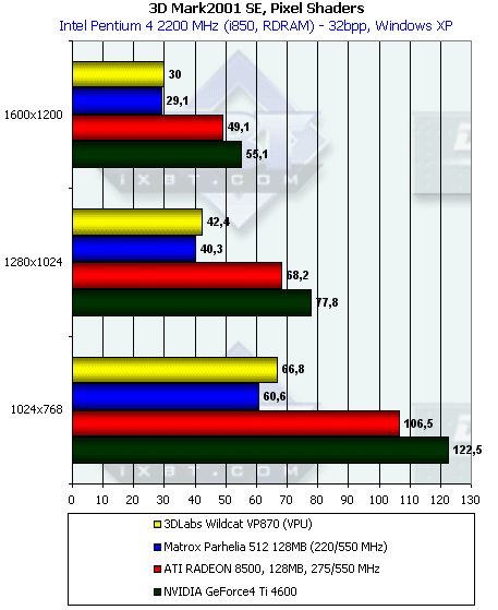 Как мы видим, в целом положение 3Dlabs Wildcat VP870 в игровых тестах DirectX 8.1 оказалось между ATI RADEON 7500 и RADEON 9000 Pro. Но это благодаря тому, что карта поддерживает пиксельные шейдеры, и поэтому Game4 функционирует. Ниже мы убедимся в том, что реальная скорость бывает даже ниже, чем у GeForce4 MX 440 (который по сумме баллов проиграл из-за отсутствия результатов по Game4).