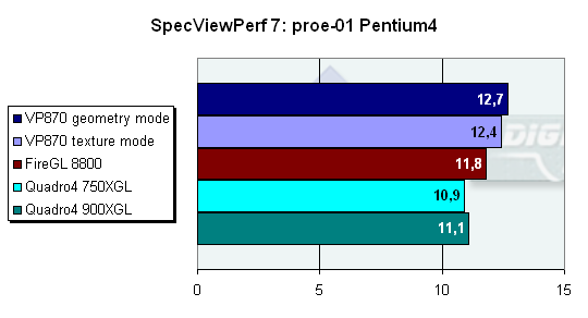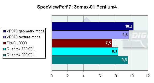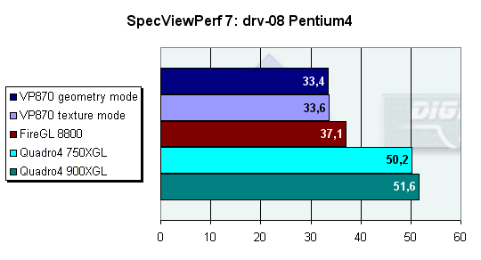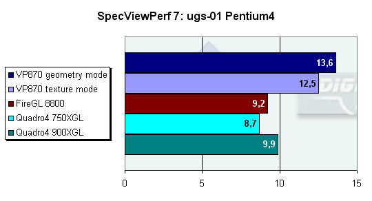 Расстановка сил кардинально поменялась, и в этом тесте мы будем сравнивать уже не VP870 vs Quadro4, а VP870 vs FireGL 8800, потому что FireGL 8800 быстрее, чем Quadro4 900XGL, в свою очередь, VP870 быстрее FireGL 8800. VP870 быстрее, чем FireGL 8800, на 7.6%, и быстрее Quadro4 900XGL на 14.4%. Тест несет смешанную нагрузку, и разница между геометрическим и текстурным режимом оптимизации невелика — составляет чуть более 2%.