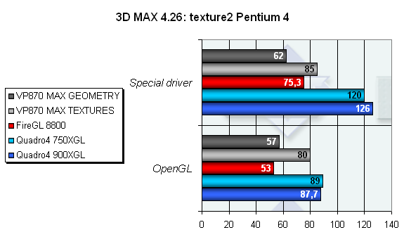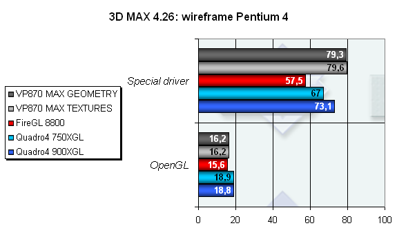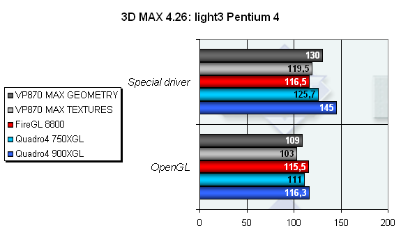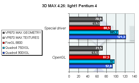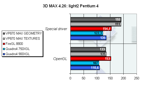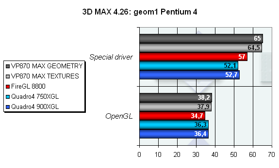 Тест на геометрические возможности подтверждает лидерство VP870 в области обработки сложной геометрии. Небольшое преимущество при работе в OpenGL и уверенное лидерство под управлением специального драйвера. Сделаем вывод: 3Dlabs очень ответственно подошли к специальному драйверу, он не является просто враппером, а существенно оптимизирует вывод изображения.
