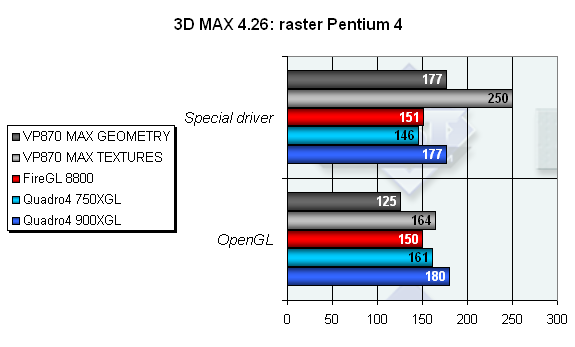 Начнем исследования с тестирования скорости работы на стандартных демосценах, что идут в комплекте 3DS MAX. Поясним условные обозначения на диаграммах. Под термином "Special driver" мы понимаем специальный драйвер от производителя видеокарты, который предназначен только для работы в 3DS MAX. Драйвера от компании ATI называются MAXIMUM, драйвера от компании NVIDIA называются MAXTREME, а драйвер для VP870 от 3Dlabs никак не называется, более того, он не имеет каких-то своих функций управления, используя только стандартные настройки 3DS MAX. Под термином "OpenGL" подразумевается работа через стандартный OpenGL драйвер. Мы помним, о том, что в тесте SPECviewperf 3dmax-01, основанном на движке 3DS MAX, VP870 оказался первым и является вероятным кандидатом на звание наиболее предпочтительной карты для работы с этой системой трехмерного моделирования. Расставим же точки над i.