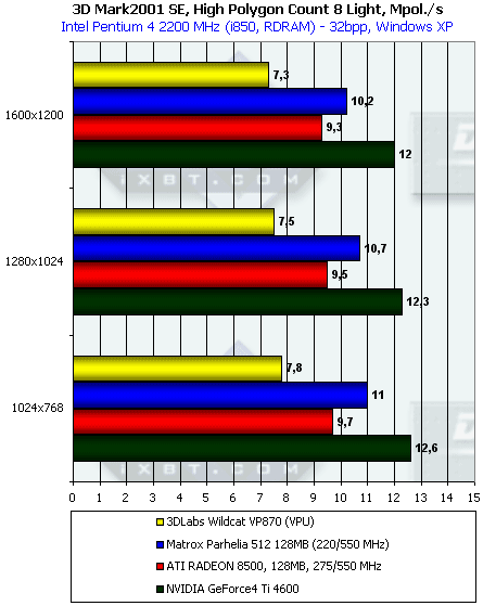 В случае 8 источников света Parhelia несколько реабилитирует себя: с ростом числа источников его производительность падает более медленно, чем RADEON 8500. Лидер — по-прежнему Ti 4600, аутсайдером теперь становится P10.
