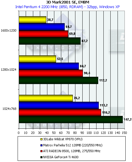 В целом по 3DMark2001 можно сказать, что наши предварительные результаты тестирования в синтетике и выводы по ним полностью подтвердились практикой: 3Dlabs Wildcat VP870 и ее драйверы пока никоим образом не приспособлены к DirectX игровым приложениям. Пока невозможно даже четко сказать, кто больше виноват: драйверы или баланс возможностей самого P10. Будем ждать известий от Creative Labs — нынешнего хозяина 3Dlabs, который обещал выпустить на рынок игровой акселератор на базе P10. Тогда мы сможем подробно исследовать: что в этом вопросе изменилось в лучшую сторону.